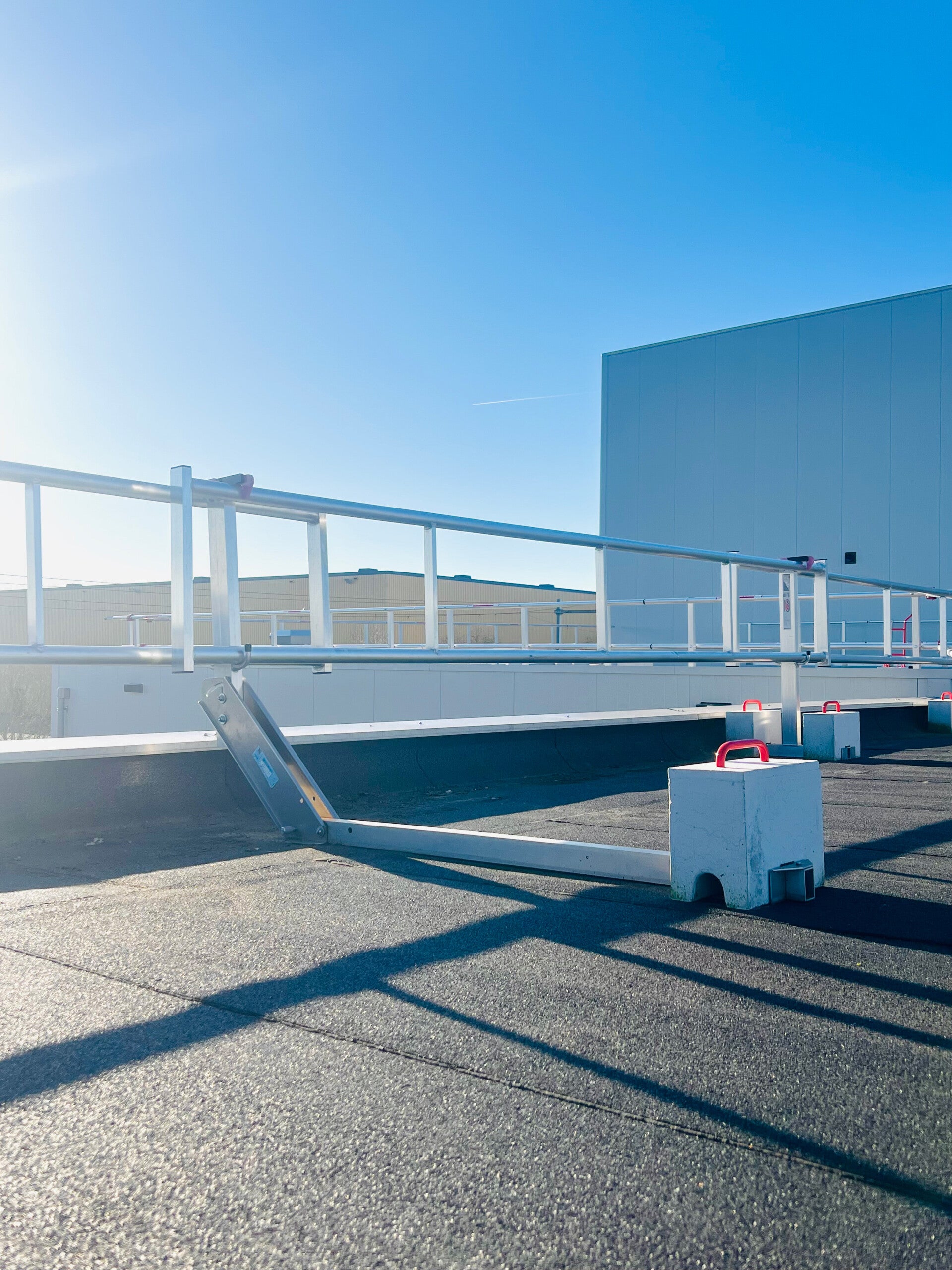 Neben Gebäuden mit Steildächern gibt es selbstverständlich auch zahlreiche Gebäude mit Flachdächern. Beispiele hierfür sind Garagen, Gewerbegebäude, Schulen, Mehrfamilien-häuser, Gründächer (Sedum), Krankenhäuser und andere Nebengebäude. Auch auf diesen Dächern möchten Sie sicher arbeiten. Mit unserem RSS Flach Dach Klassik System ist diese Sicherheit gewährleistet. Es ist für alle Dachtypen mit einer Neigung von bis zu 10 Grad geeignet. Das System kann einfach von einer einzigen Person montiert werden. Reicht die Höhe des Dachrandes nicht aus, kann eine Fußleiste hinzugefügt werden, um die notwendige Trittkante zu schaffen. Für dieses System wird pro Ständer nur ein Betonblock benötigt.